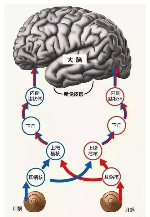 双耳在头颅的解剖位置使其在听觉功能方面有很多优势,包括声音定位、回声抑制及 在复杂声音环境中随意提取所需声音等。双耳之间的距离使声音首先到达离声源近的一侧耳,然后到达远离声源的一侧耳,因而造成了双耳之间的时间差异。而且头颅的声质量使到达离声源较远耳的声音的能量(特别是高频声)发生衰减,产生了双耳之间强度和频谱形态的差异。这些差异能够提供方位(水平面上的方向)信息,特别是在低频(低于1000Hz)和高频(高于2000Hz)更为重要。耳廓、耳道和躯干也能够改变到达耳的声音的频谱形态,从而为声音定位提供信息。