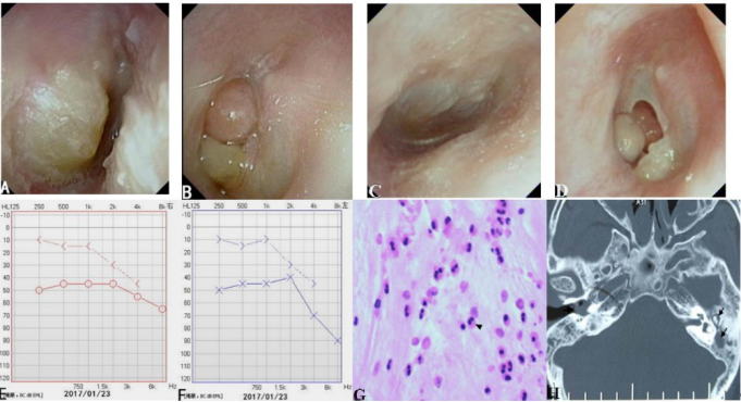 图3嗜酸粒细胞性中耳炎辅助检查图(54岁女性患者)。治疗前(A,B),治疗后(C,D)右耳,左耳耳纤维内镜图;双耳呈混合型听力下降(E,F);HE染色×400倍镜下中耳分泌物中嗜酸性粒细胞(G);颞骨CT图像(H)。