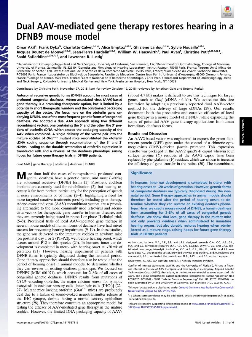这些发现发表在《美国国家科学院院刊》(PNAS)上,为未来对DFNB9患者进行基因治疗试验开辟了新途径。