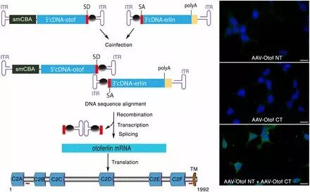 不过科学家们通过采用一种被称为腺相关病毒双策略的方法克服了这一限制,因为这一方法使用了两个不同的重组质粒,一个包含5'端,另一个包含耳畸蛋白cDNA的3'端。